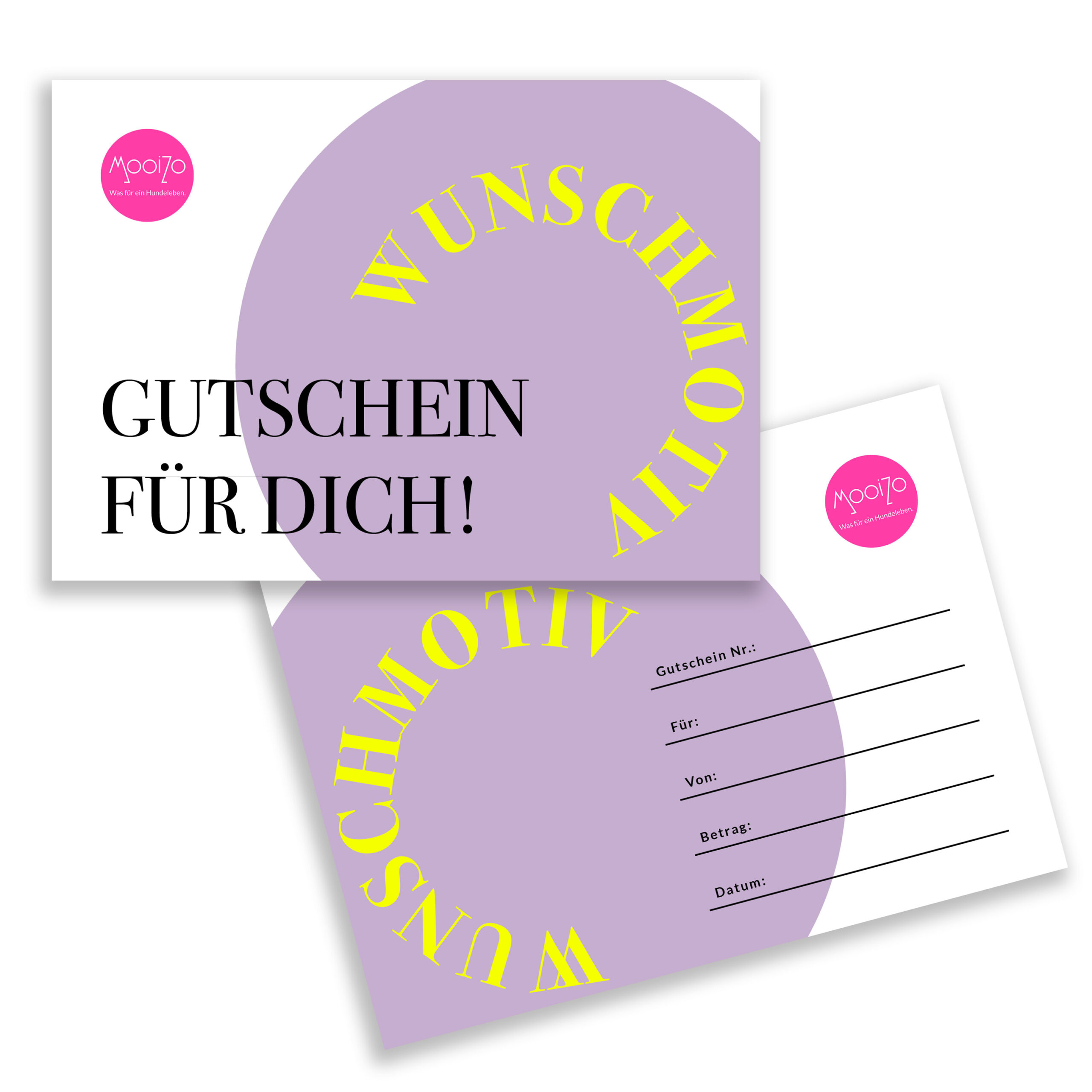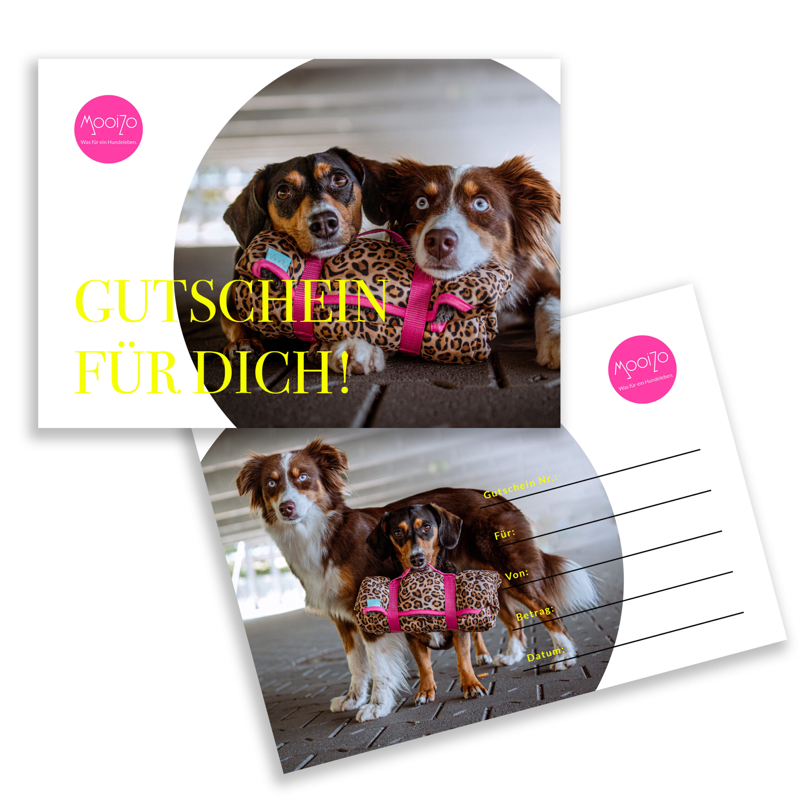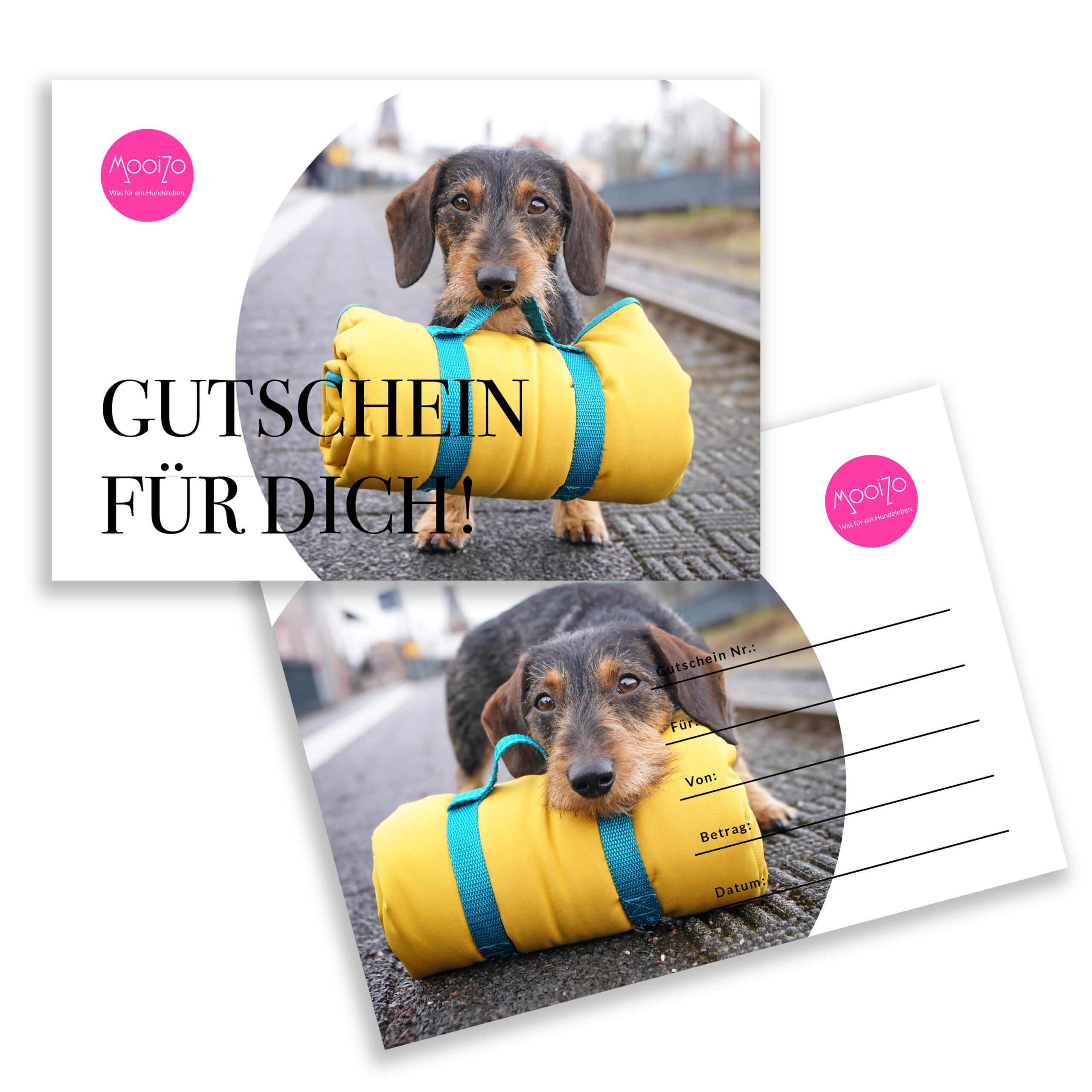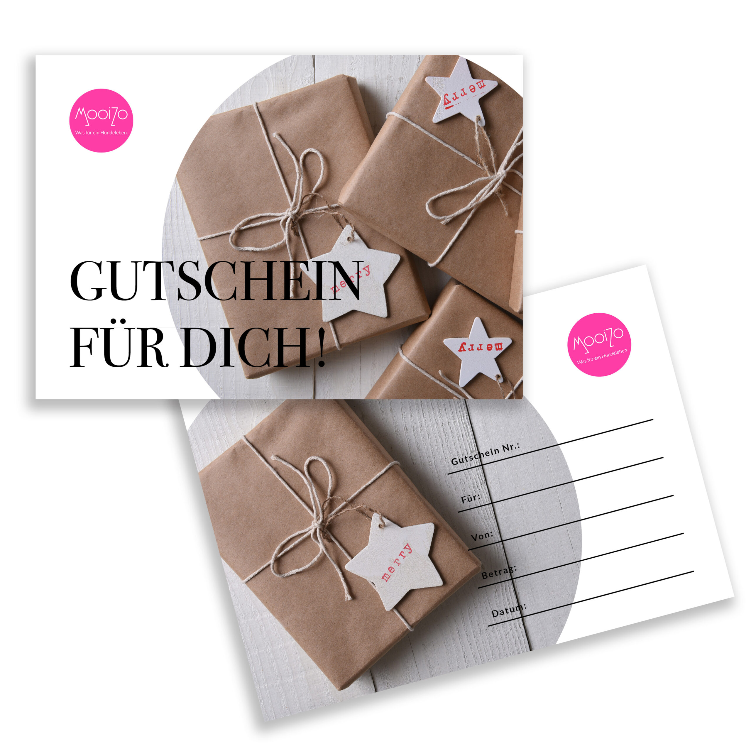 Der MooiZo Gutschein: ideales Geschenk für Hundebesitzer. Personalisierbar mit Wunschmotiv, als PDF per e-Mail – einfach weiterleiten oder ausdrucken.